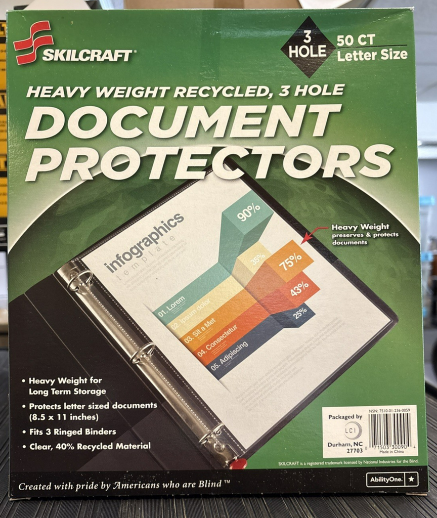 NEW Skilcraft Heavy Weight Recycled 3 Hole Document Protectors Letter Sz (50 PK)