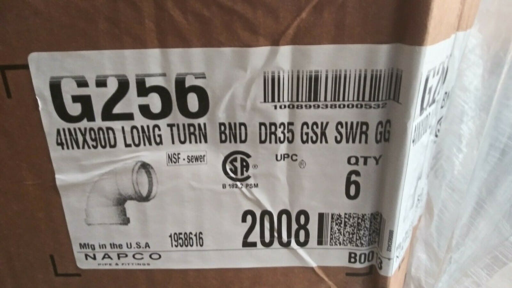 (1 BOX OF 6) NEW NAPCO G256 G-Series PVC Gasketed SDR35 Sewer Long Sweep