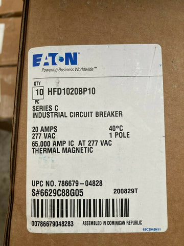 (10) Eaton HFD1020BP10 Series C Molded Case Circuit Breaker 277V, 20 Amp, 1 Pole