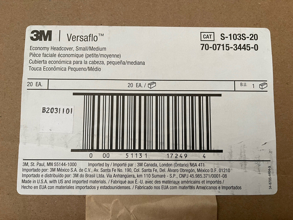 3M Versaflo Economy Headcover/capucha, pequeño/mediano, S-103S-20, (CAJA DE 20)3M Versaflo Económica Funda / Capucha,Pequeño / Medio ,S-103S-20,(Estuche De 20)