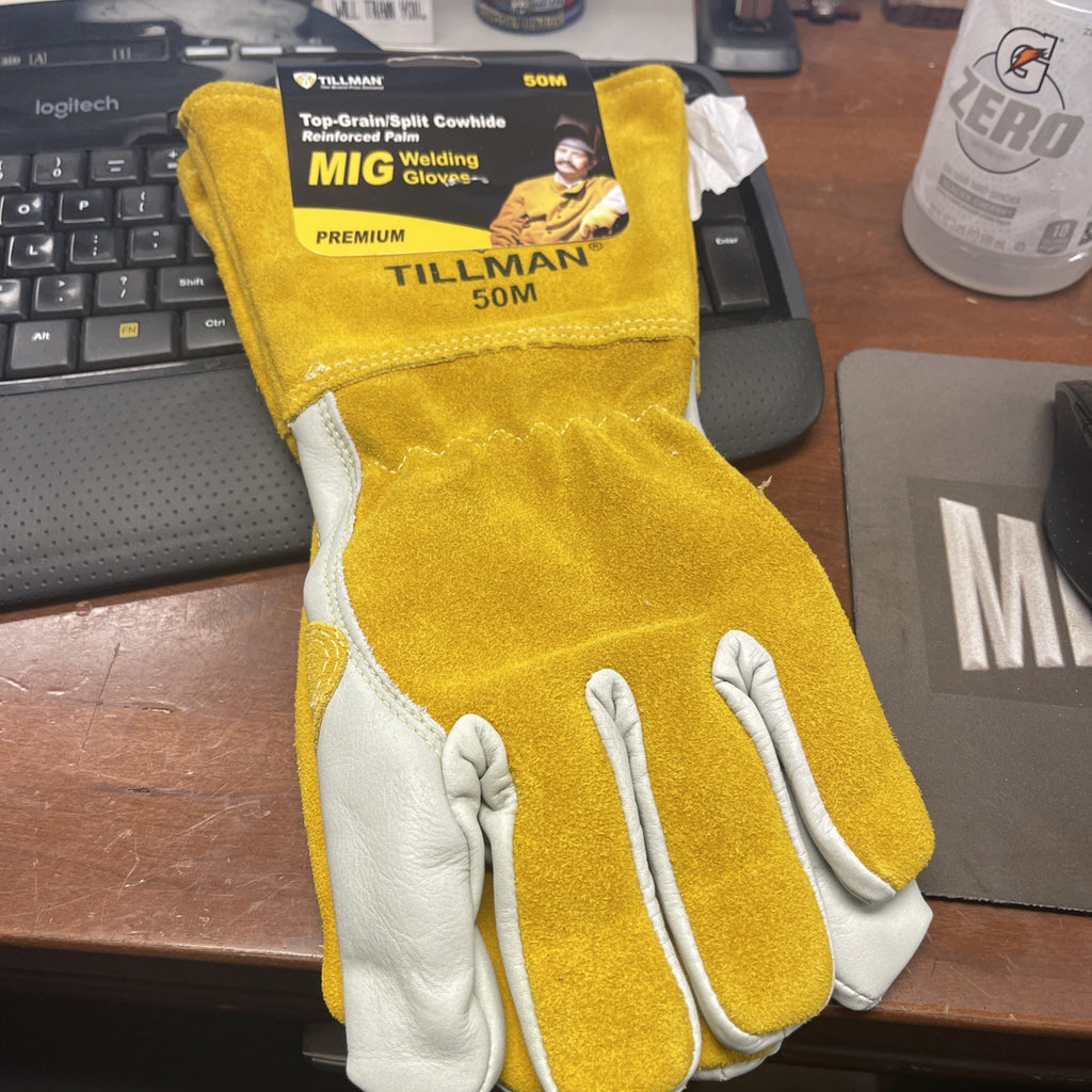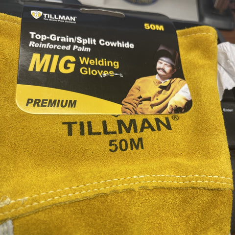 John Tillman Medium 14"" Gold and Pearl Top Grain Split Back Cowhide Fleece Lined MIG Welders Gloves with 4"" Cuff and Kevlar Thread Locking Stitch (Carded)" (50 M)