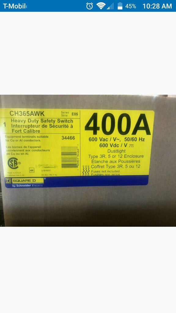 Neuf Schneider Electric CH365AWK Interrupteur Fusible HD 600-Volt 400-Amp 3P