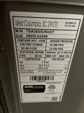 Neuf TSA060S4N45Y - 5.0 Tonnes 14 Seer à Condensation Unité 230/3, Phase 3