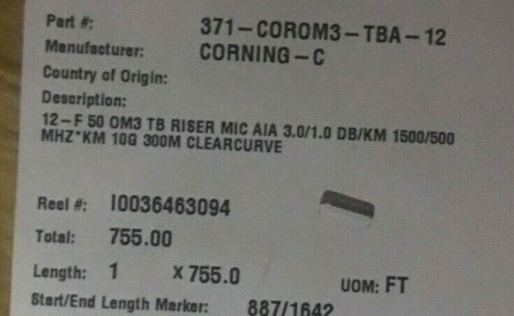 NOUVEAU VÉRITABLE Corning 371-COROM3-TBA-12 750 PIEDSNeuf Véritable CORNING 371-COROM3-TBA-12 229m