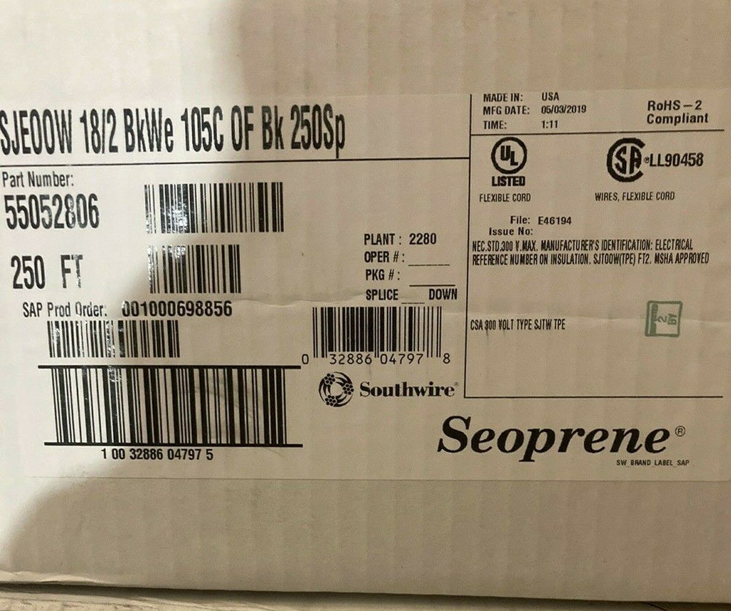 NEW 55052806 - 18/2 Sjeoow Cord 250' Reel, Seoprene Jacket
