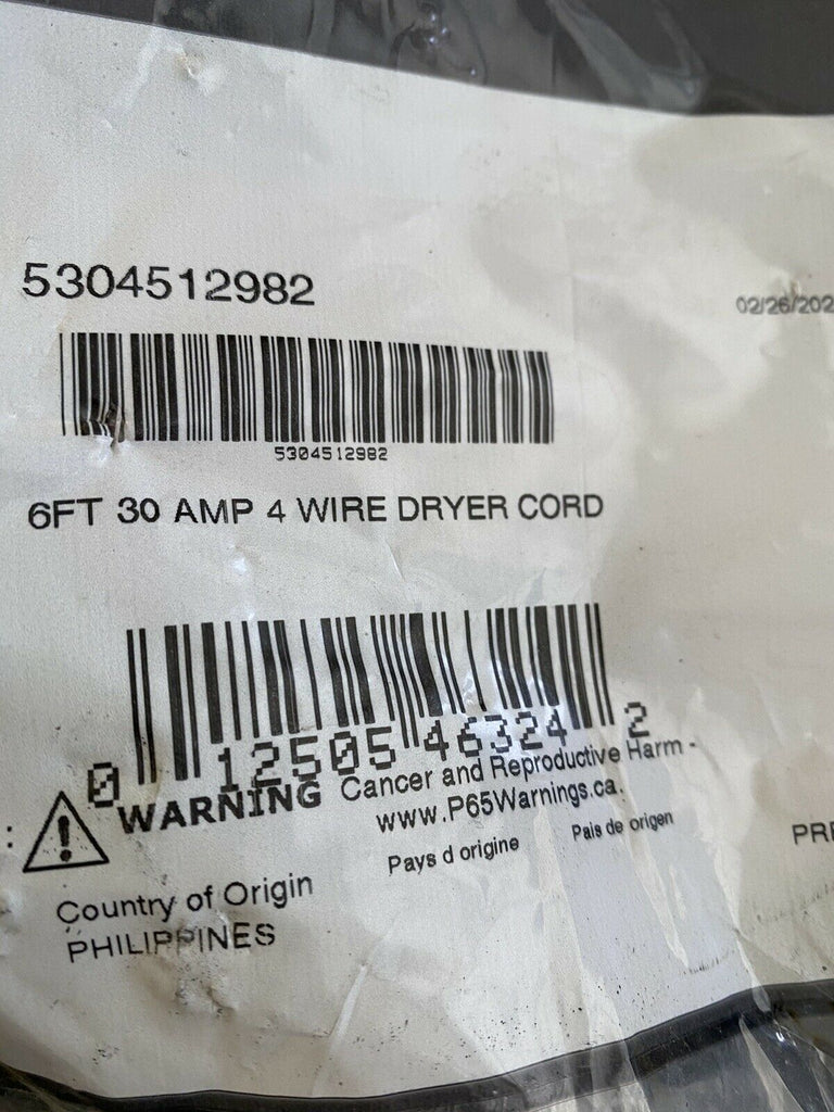 NEW Dryer Power Cord 5304512982 30 Amp 6 Foot Eyelet Terminals 4 Prong