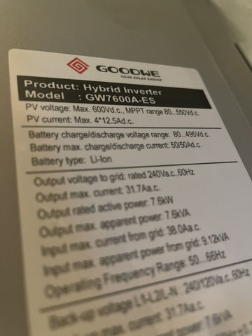 NEW GOODWE, GW7600A-ES, SPLIT PHASE HYBRID INVERTER, 7600W 4 MPPT WITH AC BYPASS