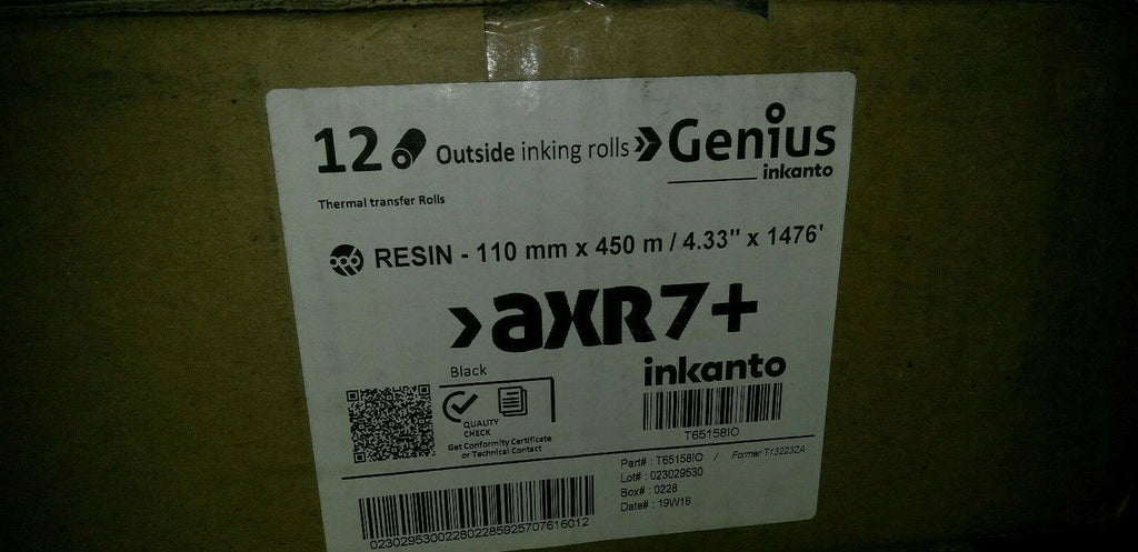 NEW Inkanto AXR 7+ Premium Resin Ribbon T65158IO - 110mm x 450m,12 Rolls/CaseNEW Inkanto AXR 7+ Premium Resin Ribbon T65158IO - 110mm x 450m,12 Rolls/Case