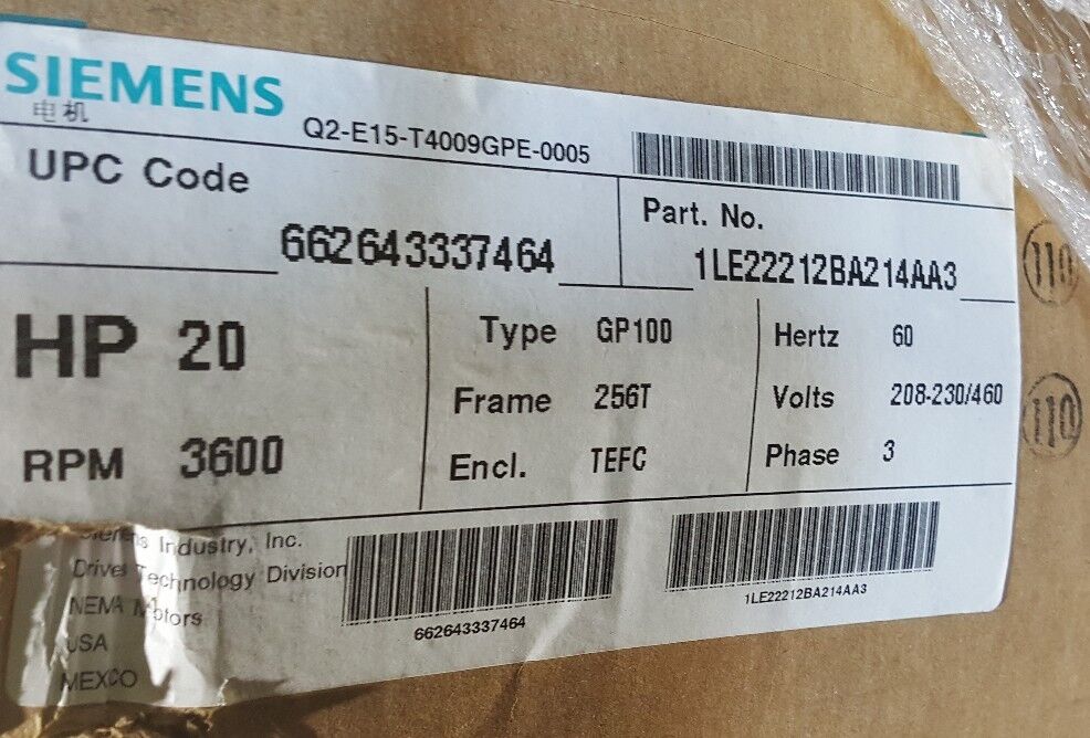 SIEMENS MOTOR GENERAL PURPOSE GP100 CAST-IRON, 2 POLE FS 256T 20 HP